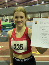 Im anschließenden Lauf über die 60 m Hürden reichte es dann nicht mehr ganz dazu, vorne mitzulaufen. 10,04 sec. bedeuteten am Ende Rang 10 und damit keine Finalteilnahme. Am Nachmittag ging es gleich weiter mit den Sprints über 60 m "flach". Johanna Marker erwischte hier in 8,48 sec. einen sehr guten Lauf und verbesserte ihre Bestleistung damit deutlich, wenngleich es knapp nicht reichte, um ins B-Finale einzuziehen. Anna gelang in 8,42 sec. der Sprung ins B-Finale. Hier konnte sie sich allerdings nicht mehr steigern und belegte in 8,46 sec. insgesamt Rang 9. Über die 60 m griff dann auch Niklas Krischer in der MU18 ins Geschehen ein. Er konnte seine Bestleistung ebenfalls auf glatte 8,00 sec. steigern, was jedoch bei sehr starker Konkurrenz ebenfalls nicht für den Endlauf reichte.