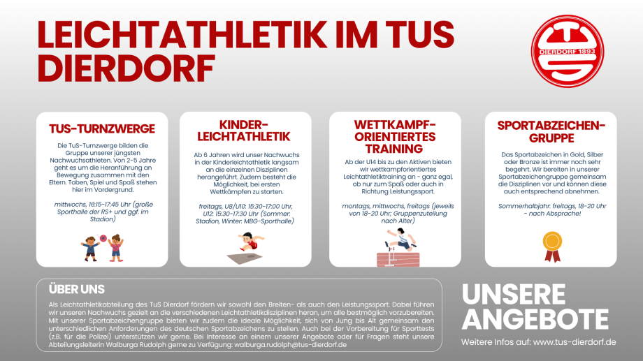 Die Leichtathletik bildet eine unserer aktuellen Abteilungen des TuS Dierdorf und bietet Sportbegeisterten jeden Alters vielfältige Möglichkeiten, sich zu bewegen, die sportlichen Fähigkeiten zu entwickeln und an Wettkämpfen teilzunehmen. Seit vielen Jahren prägt die Leichtathletik das sportliche Leben im Verein und ist fester Bestandteil unseres breiten Angebots im Breiten- und Wettkampfsport.
