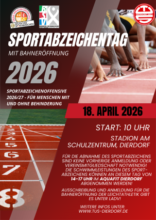 Auch in 2026 richtet der TuS Dierdorf wieder den Sportabzeichentag in Verbindung mit der Bahneröffnungd der Leichtathleten aus. Am 18. April geht es ab 10